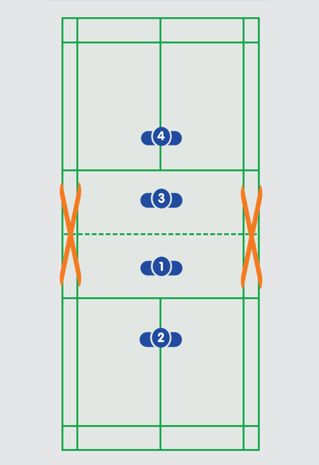 Per team mag er een speler voor de servicelijn staan. Nadat deze speler geslagen heeft stapt hij terug achter de servicelijn en komt de andere speler in het veld staan. De shuttle moet onderhands en in een rechte lijn in het spel gebracht worden. Als de shuttle achter de servicelijn geslagen wordt is de shuttle uit.