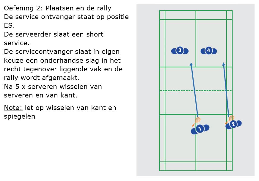 Het aanleren/verbeteren plaatsen van de shuttle van de short service i.c.m. plaatsen.