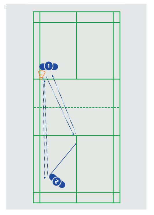 Aangever speelt shuttle naar de T, werker speelt naar buiten in de tramrails (iets over korte servicelijn) en aangever speelt lob rechtuit. Werker speelt vanuit lob een drop naar het midden van de halve baan en zo verder.